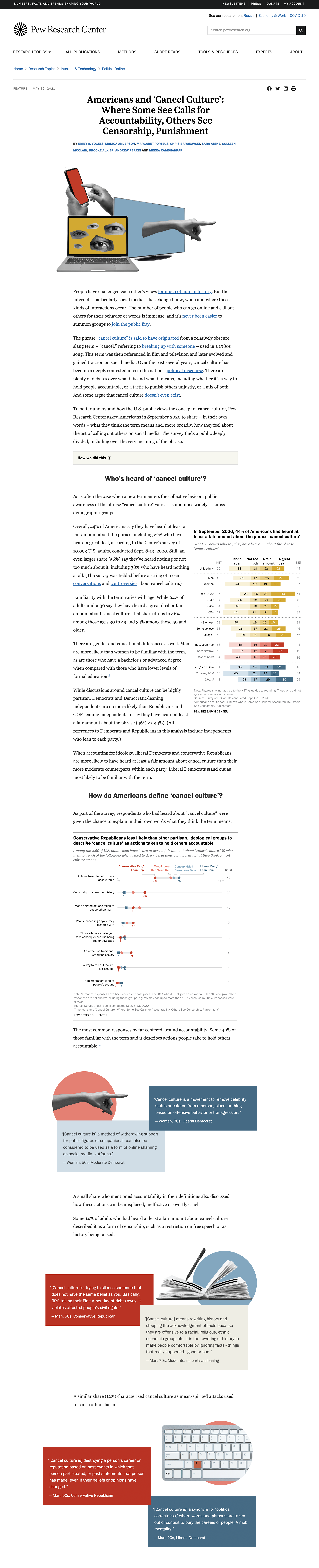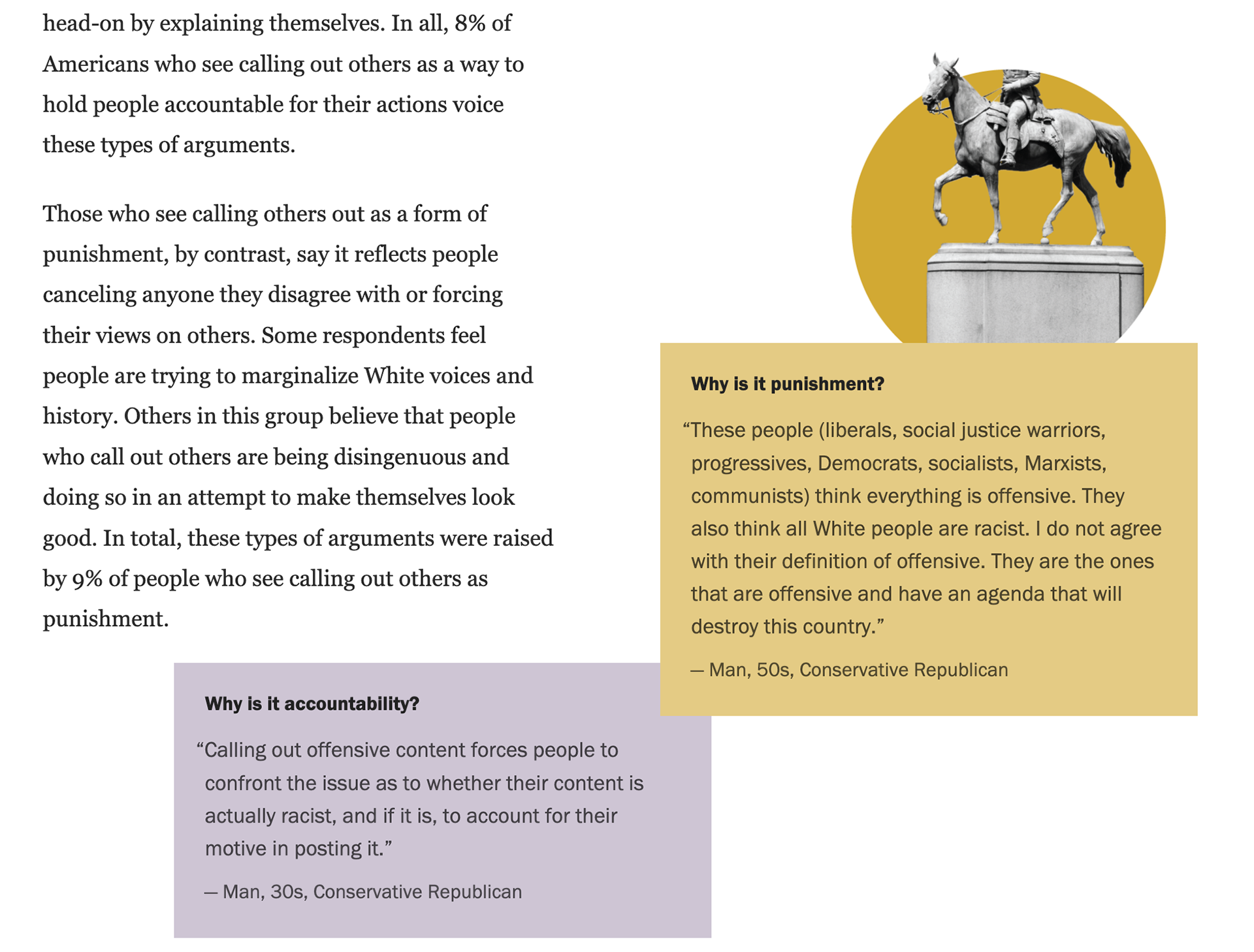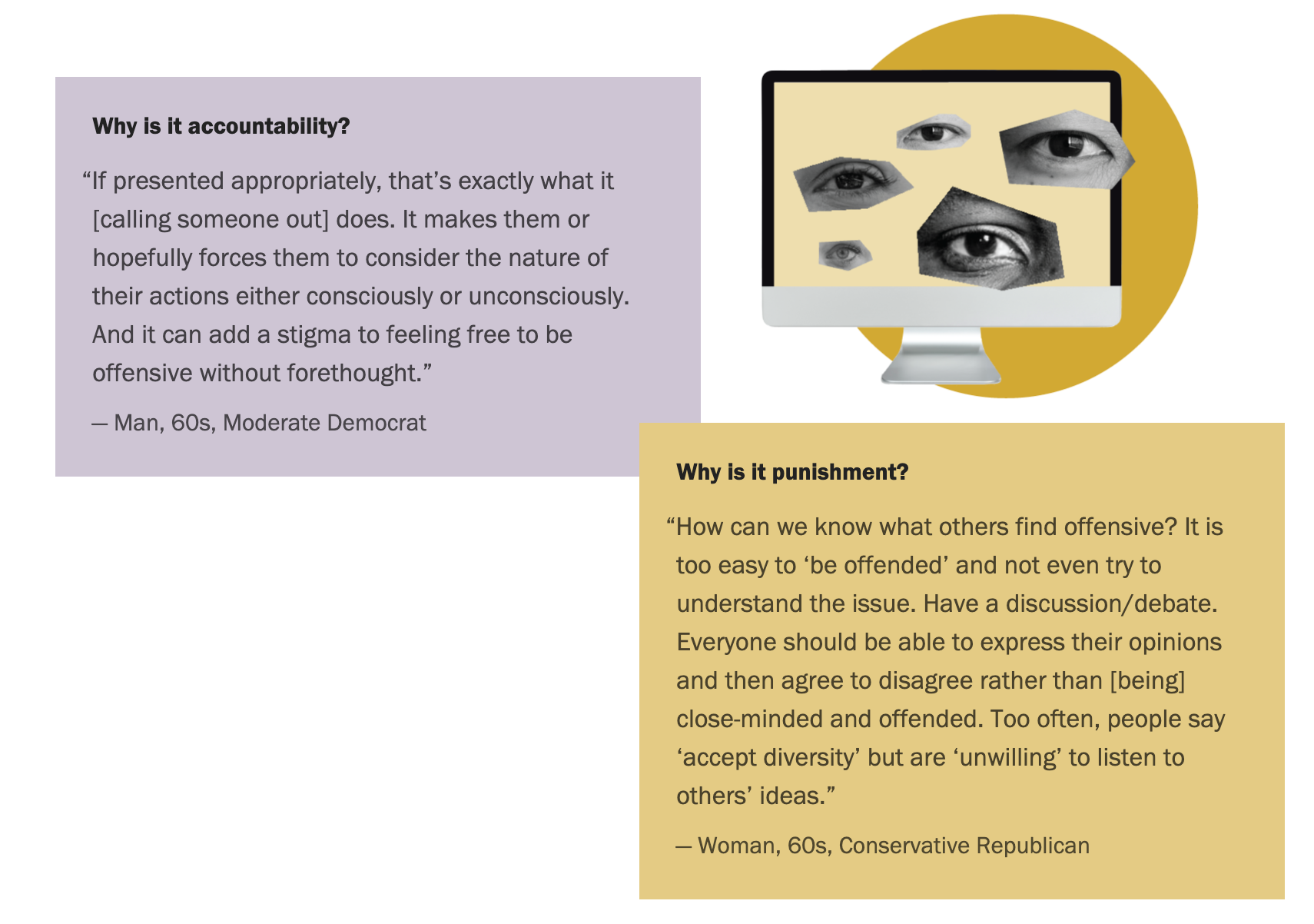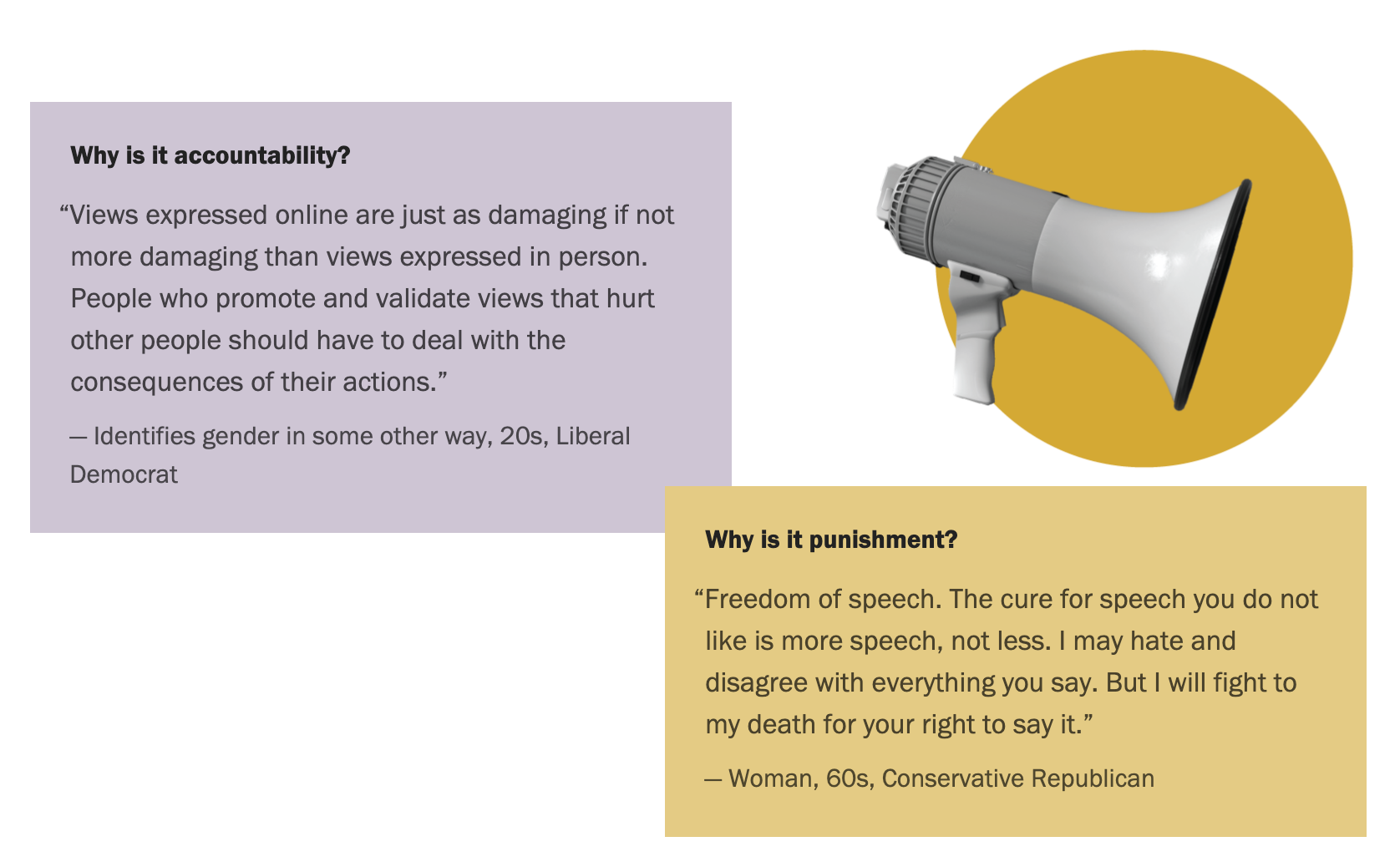 Shown below is the illustration I created to accompany Pew Research Center's data essay titled "Americans and ‘Cancel Culture’: Where Some See Calls for Accountability, Others See Censorship, Punishment."