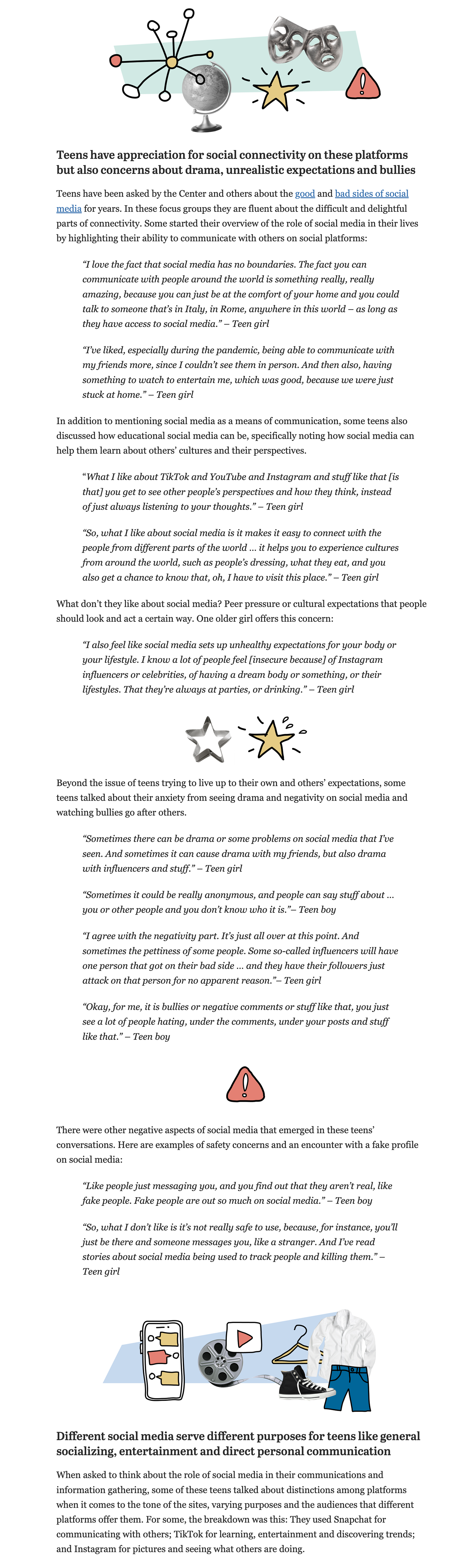 I created illustrations for a report chapter featuring focus group findings in Pew Research Center's "Connection, Creativity and Drama: Teen Life on Social Media in 2022". An excerpt with some of the illustrations is shown below. See the full chapter here.