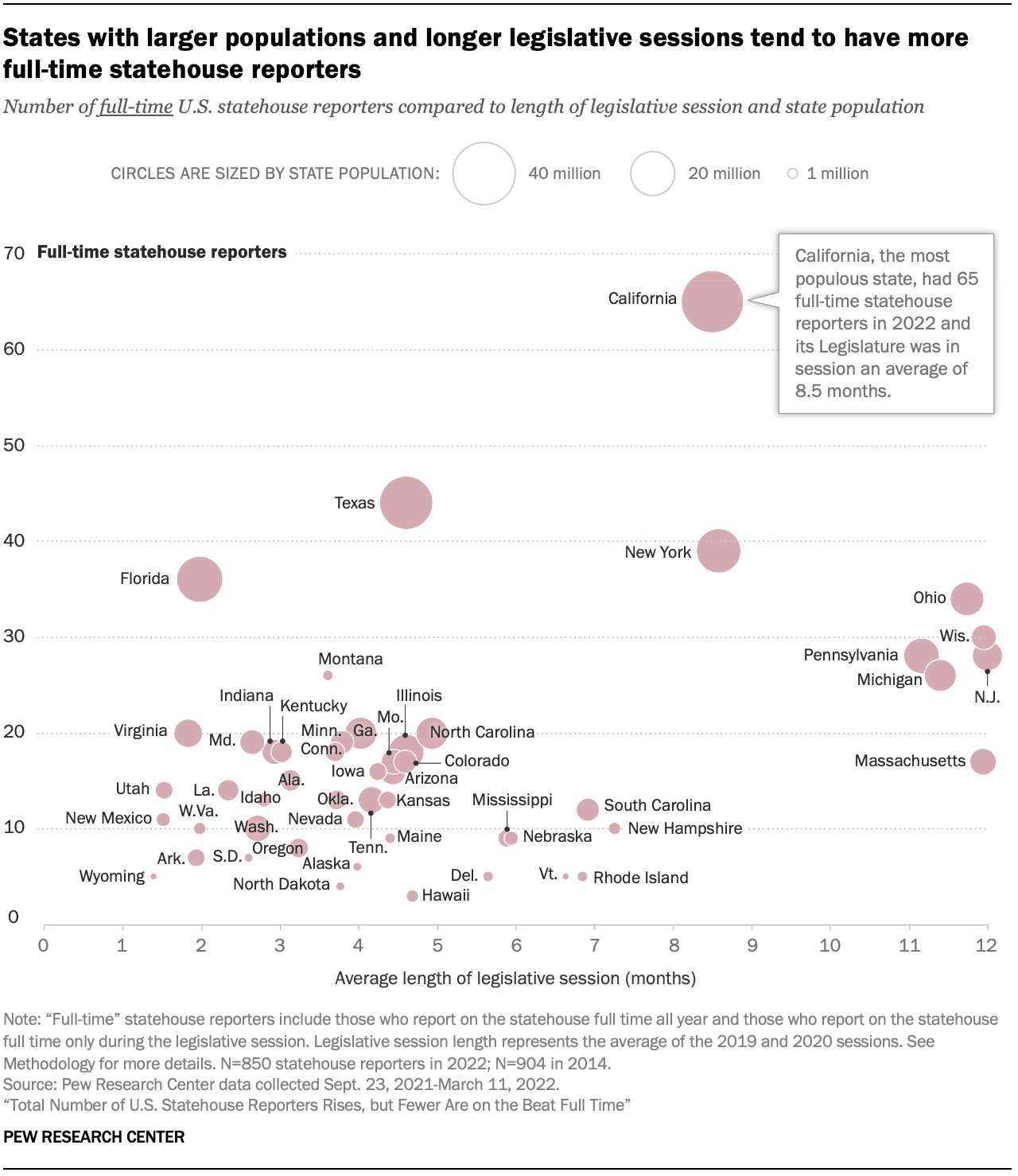 This first is a scatterplot showing the relationship between the number of statehouse reporters and the length of each state's legislative session. It also uses bubbles to show the population of each state.